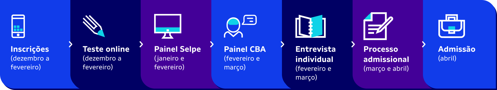 Aqui, você vai trilhar um desenvolvimento completo: integração, capacitação e imersão na cultura, nos valores e no jeito de ser CBA.