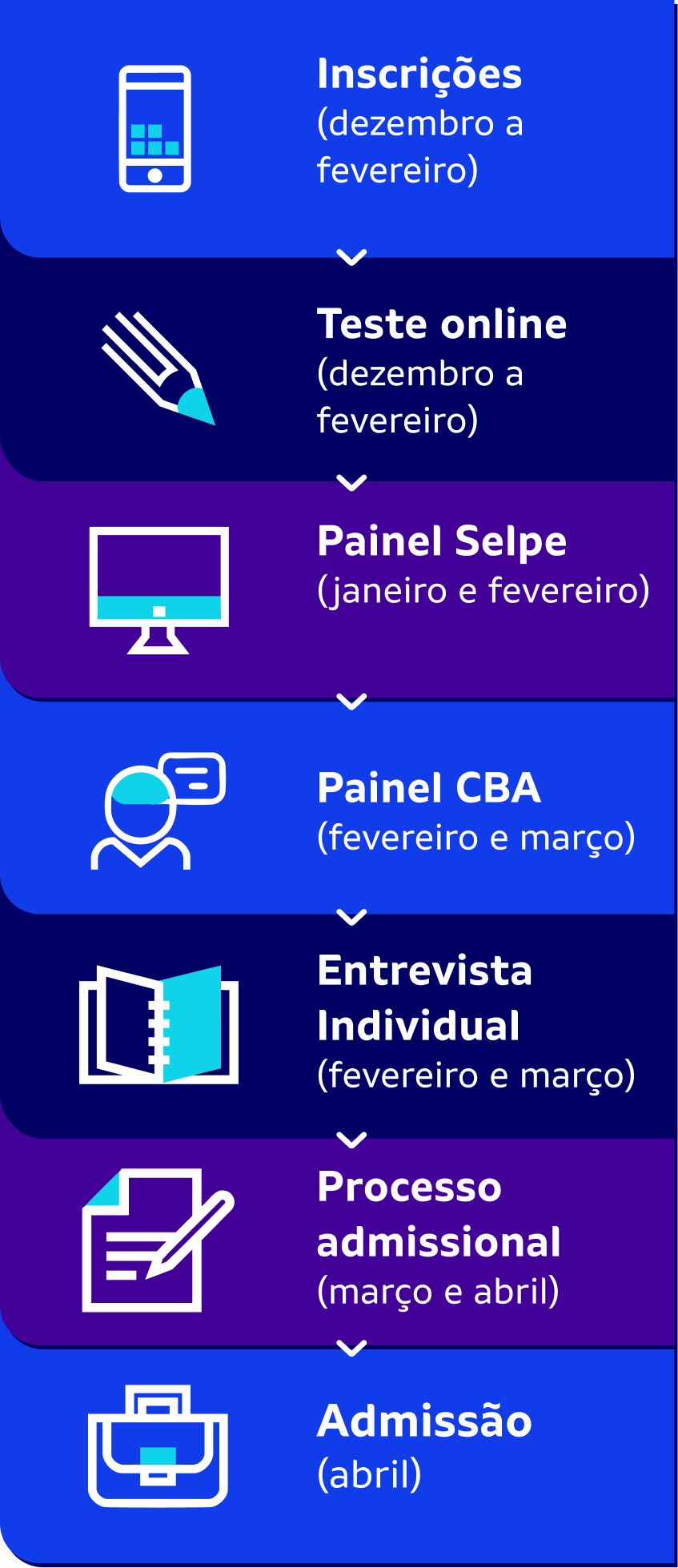 Fique tranquilo(a)! Todos os retornos — positivos ou não — serão enviados para o e-mail que você cadastrou no Recrutamento Inteligente, sempre após a conclusão de cada etapa do processo. Você também pode acompanhar as mensagens diretamente na sua área do candidato, na plataforma.